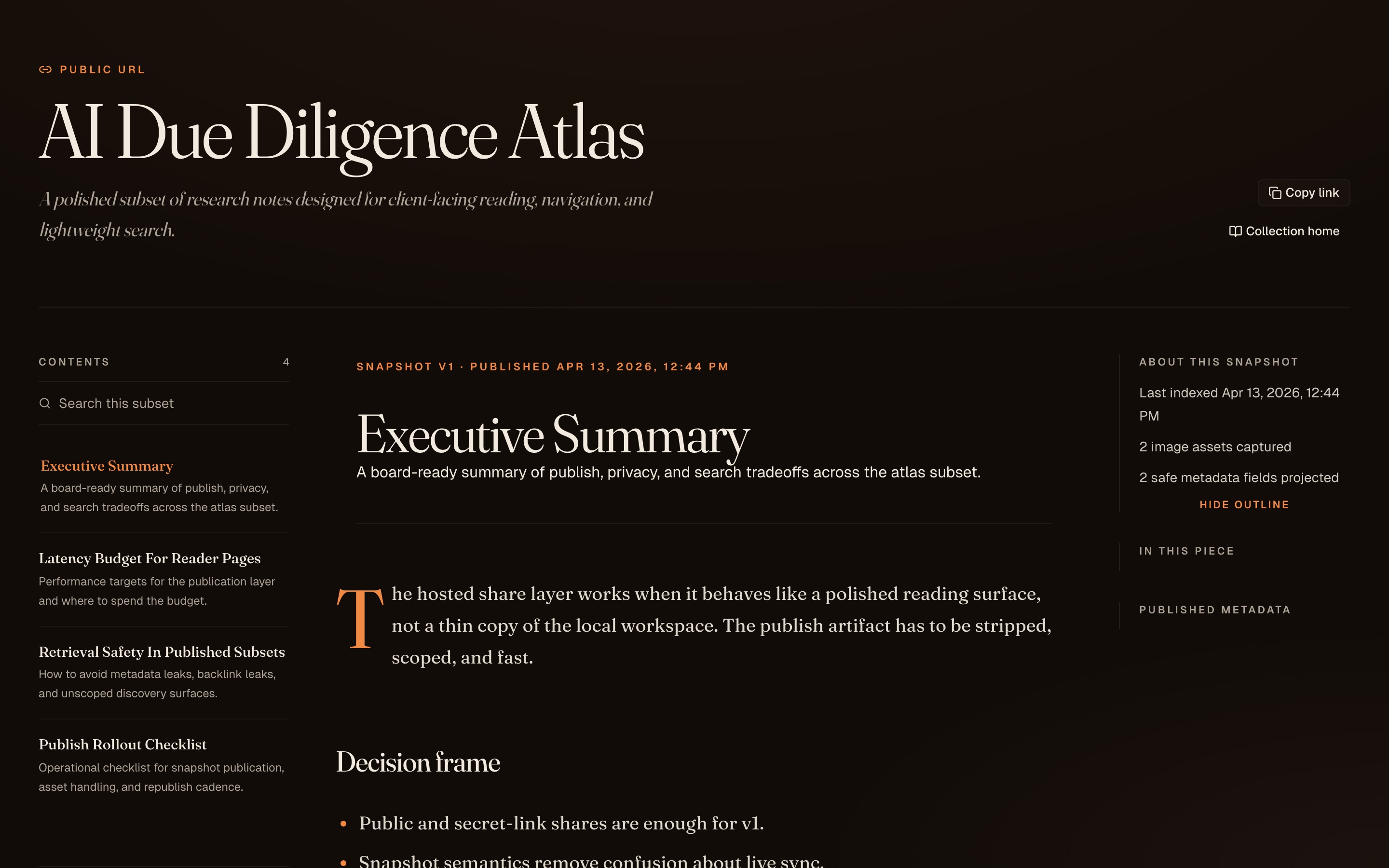 Pick any note in your workspace and publish it as a clean public URL. Private metadata is filtered out at publish time. Backlinks and related notes are disabled by default so nothing leaks from the rest of your vault.