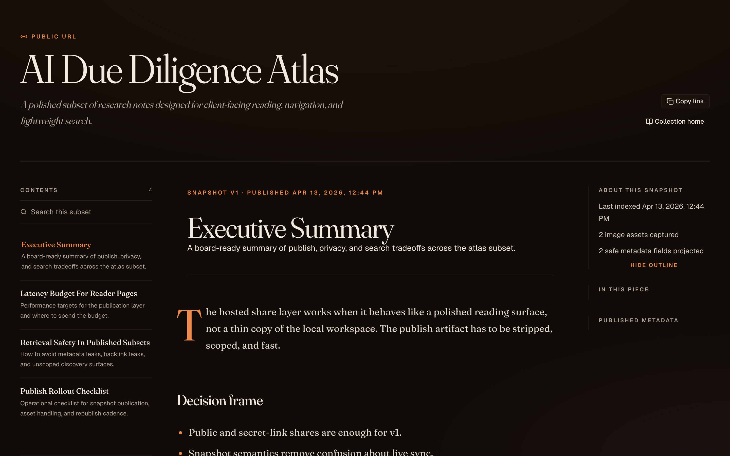 Publications are snapshots, not live mounts. Republish when you want. Rotate or revoke secret links. Expire with a click. No ambiguity for readers.