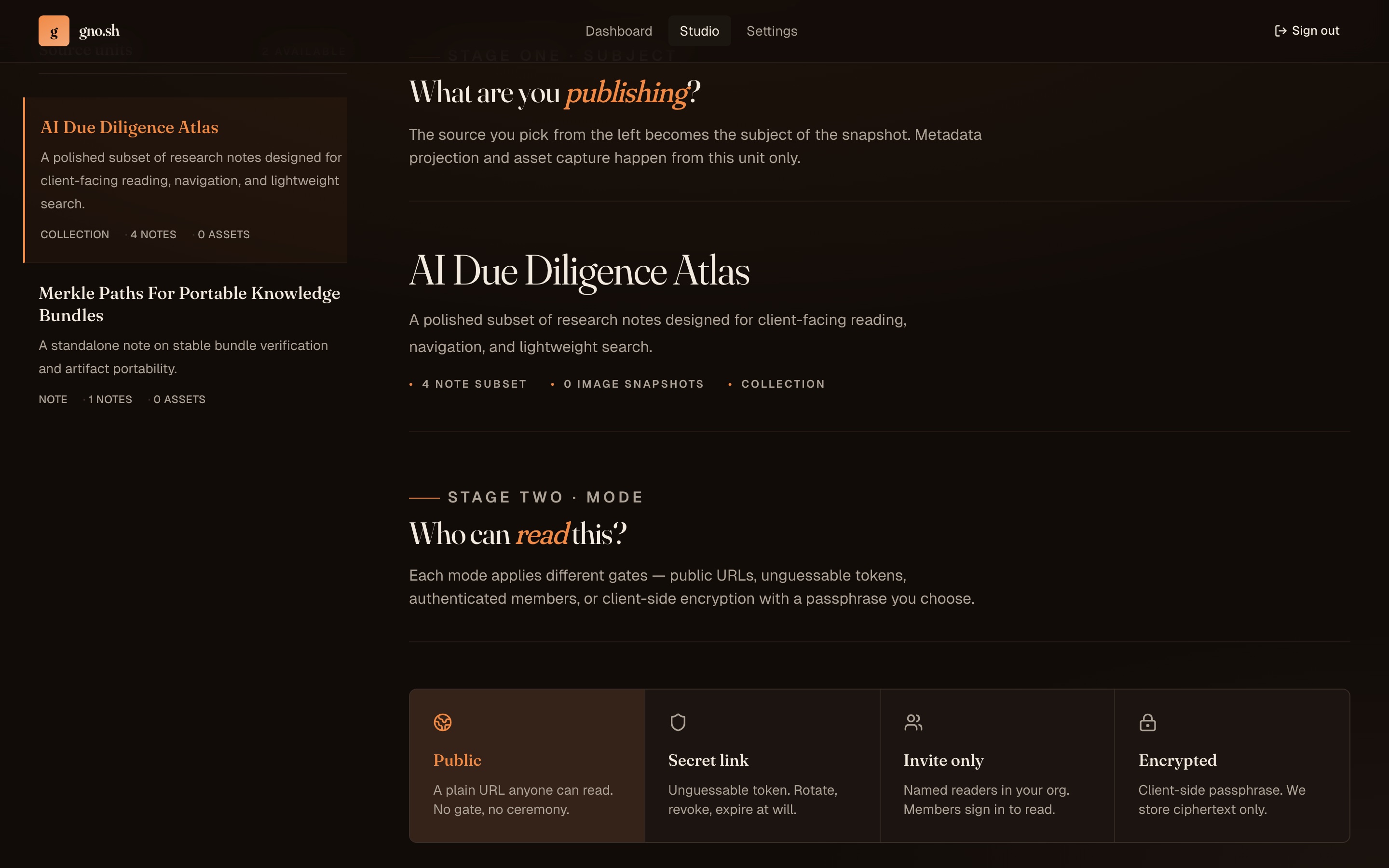 Your raw vault stays local. Run gno publish export <target> --out atlas.json, then upload that compiled artifact at /studio. gno.sh turns the snapshot into a polished surface with premium typography, an outline, keyboard navigation, and subset-scoped search. Pick public URLs, secret links, invite-only spaces, or client-side encrypted bundles.